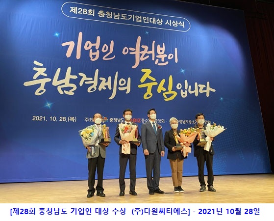 당사는 2021년 10월 28일 "제28회 충청남도 기업인 대상" 수상 기업으로 선정 되어 수상을 하였습니다 - (주)다원씨티에스 관리자 - |